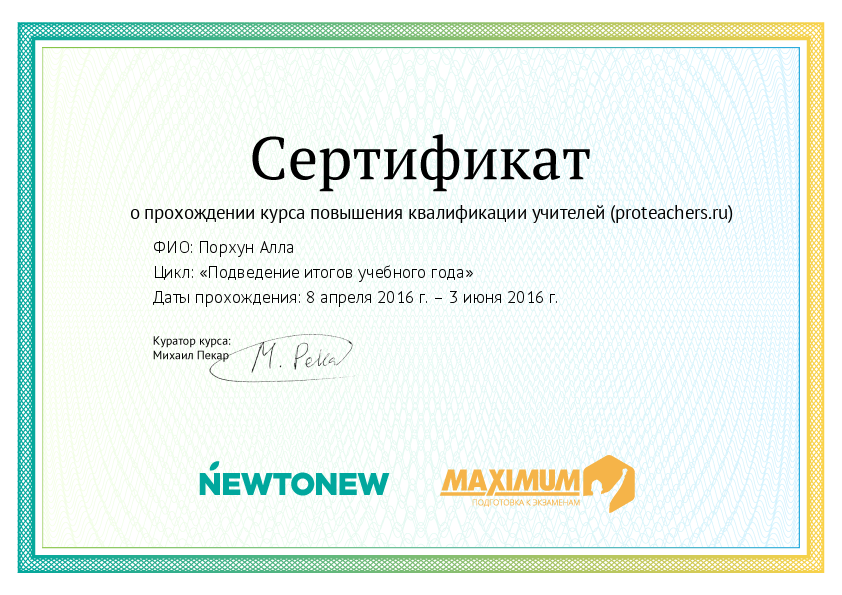 Cертификат о прохождении курса повышения квалификации учителей (http://proteachers.ru/) "Подведение итогов учебного года"