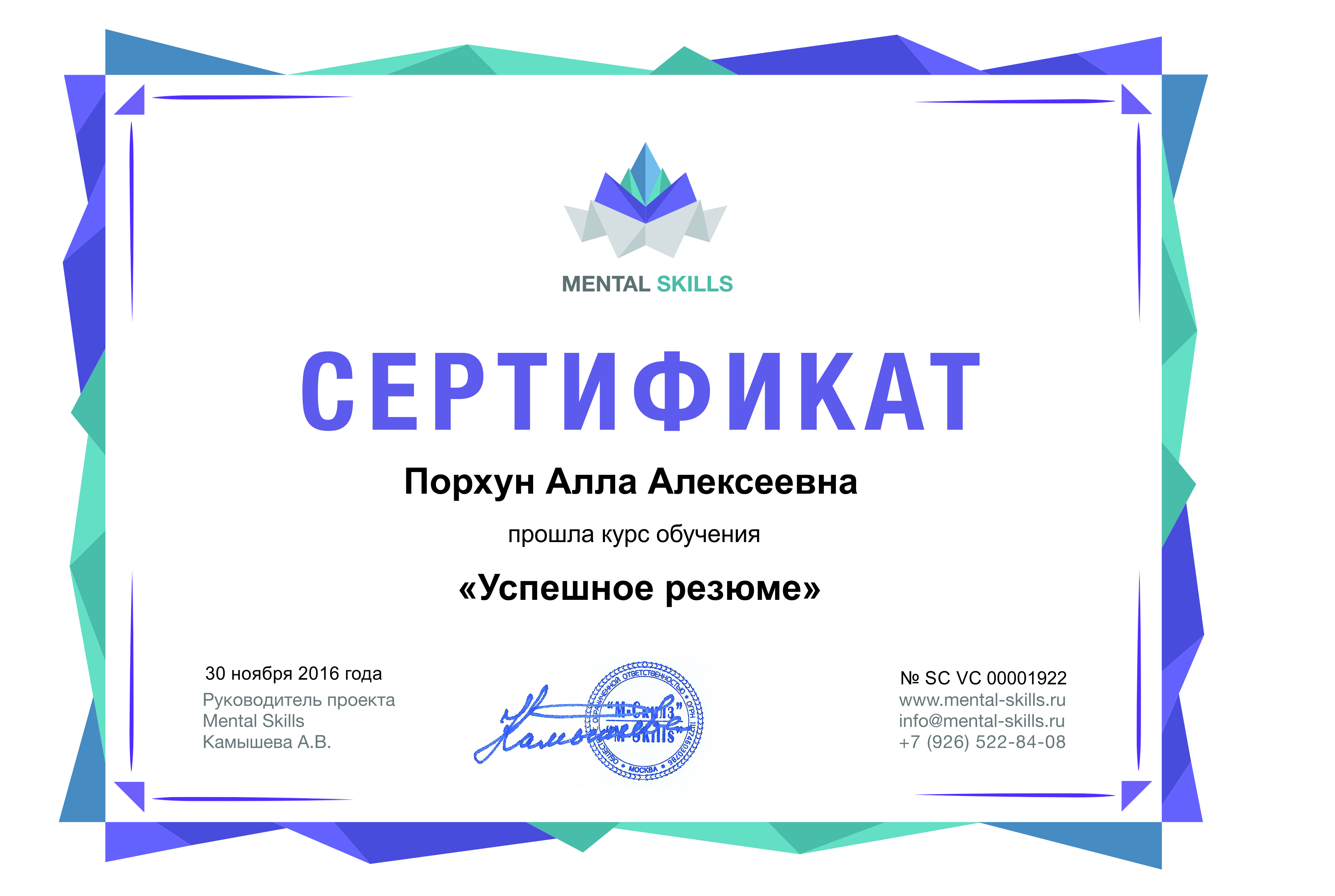 Сертификат про успешное прохождение курса "Успешное резюме" 2016.11.30