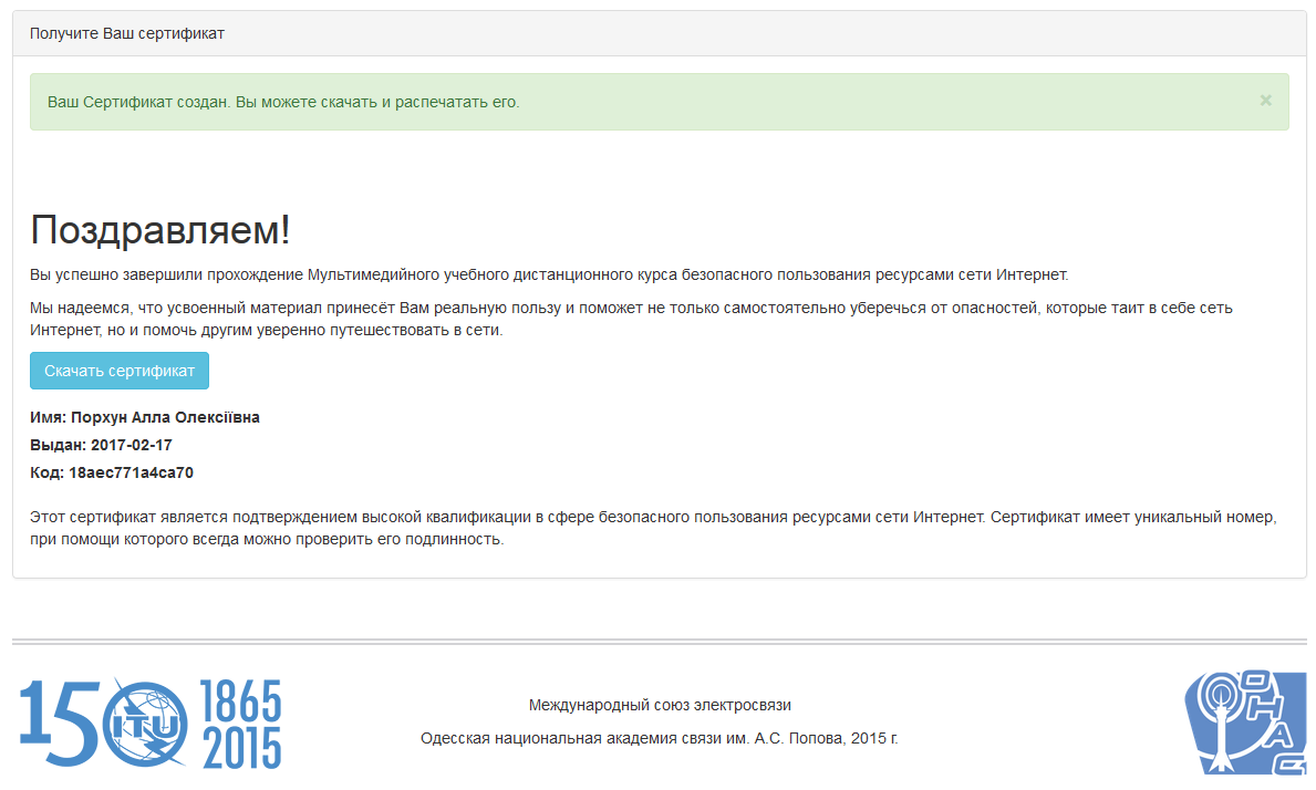 Подтверждение подлиннсти сертификата об успешном прохождении Мультимедийного учебного дистанционного курса безопасного пользования ресурсами сети Интернет